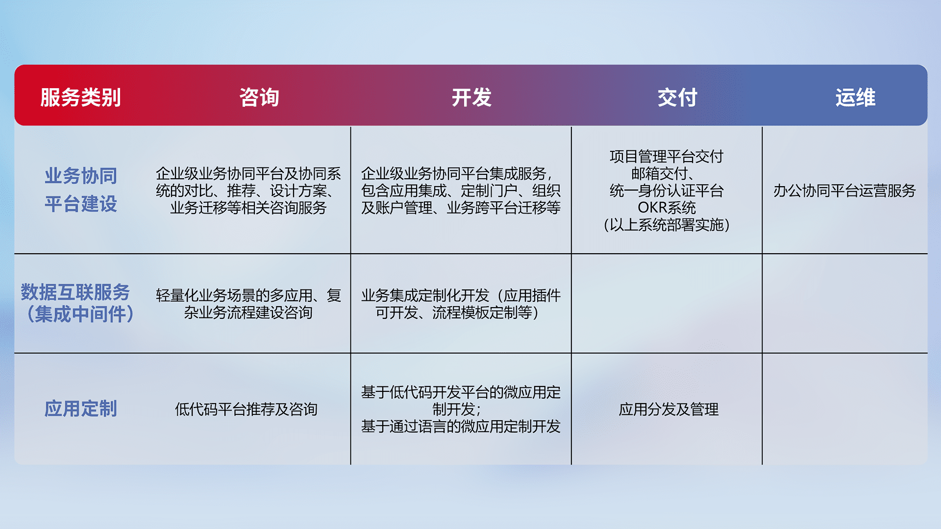 针对钉钉、、、企微、、、IDaas等平台级产品提供产品的规划、、、方案、、交付、、、定制化开发等服务,,,实现如统一协同办公、、、智能客户服务、、、混合会议管理、、智能数据查询、、等业务场景,,,,实现数字化转型。。。。